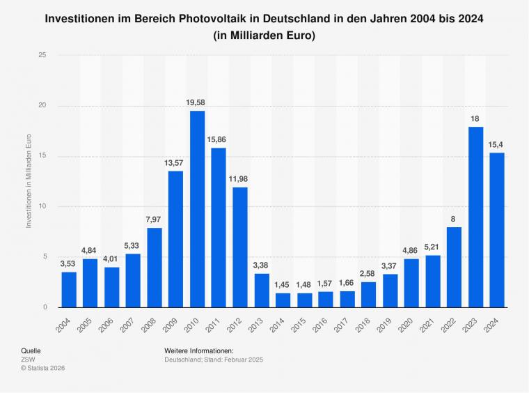 Die Statistik zeigt die Entwicklung der Investitionen im Bereich Photovoltaik in Deutschland in den Jahren 2004 bis 2024. Im Jahr 2024 wurden in Deutschland rund 15,4 Milliarden Euro in die Photovoltaiktechnologie investiert.