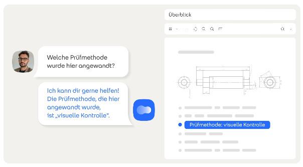 Der KI-Chat von Fabasoft Approve schafft direkten Zugang zu diesen Inhalten. Techniker:innen befragen einzelne Dokumente oder ganze Sammlungen in natürlicher Sprache und erhalten sofort präzise Antworten, ohne aufwendige Suchfilter oder Systemkenntnisse. Ein abgestuftes Berechtigungssystem stellt sicher, dass ausschließlich autorisierte Personen Zugriff auf relevante Inhalte haben.