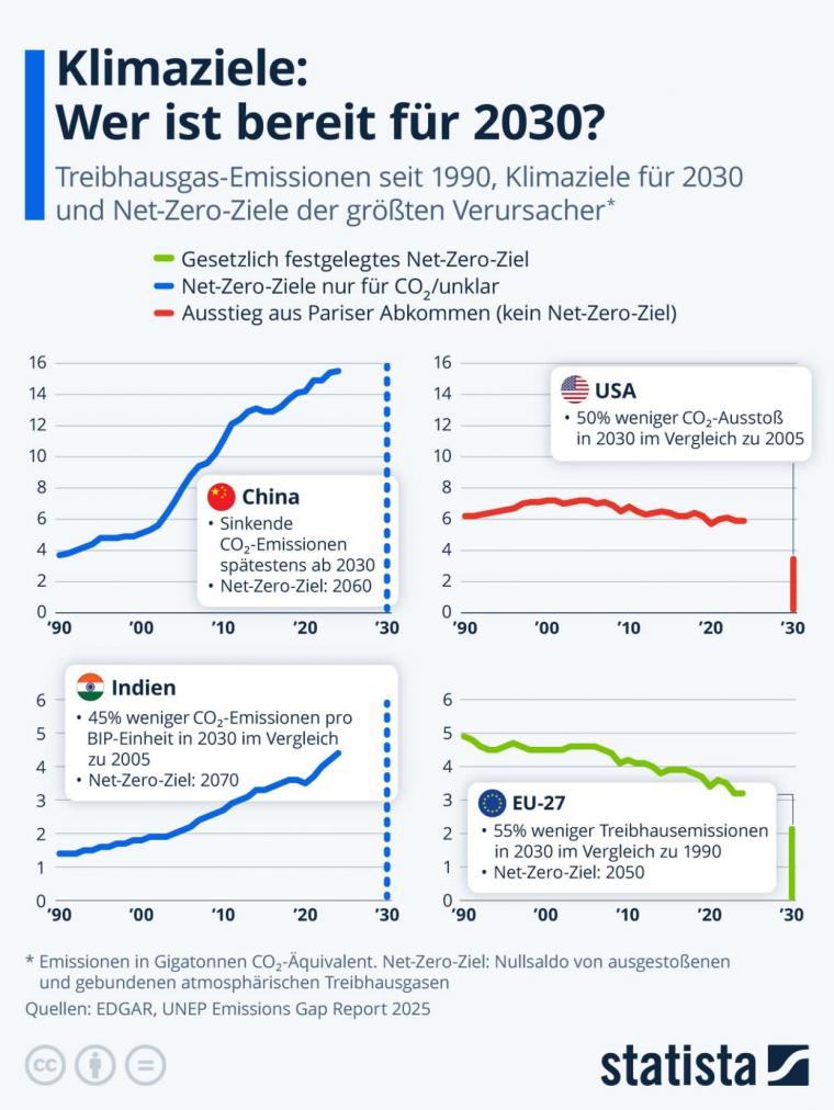 Die Grafik zeigt, wie sich Treibhausgasemissionen in den größten Verursacherländern und -regionen entwickelt haben und wie stark sie fallen müssen, damit die jeweiligen Länder ihre Klimaziele − sofern vorhanden − einhalten. Von den vier größten Verursachern, China, India, USA und der Europäischen Union, ist nur letztere auf dem Weg, bis 2030 eine signifikante Reduzierung zugunsten des Klimas zu verwirklichen.
