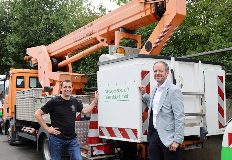 Mit einem Lächeln verabschieden sich Guido Weidmann (links) und Stefan Nykamp von vier Fahrzeugen, schicken sie diese doch auf eine gute Mission. Das Bild zeigt den Leiter des Mobilitätsmanagements bei den Stadtwerken Düsseldorf und den Geschäftsführer der Netzgesellschaft Düsseldorf vor drei Mercedes Sprinter und einem Hubsteiger, die ihren Einsatz in Düsseldorf beendet haben. Jetzt machen sie sich auf den Weg zum ukrainischen Energieversorger „d.tek“. In der Ukraine sollen sie helfen, Stromleitungen zu erreichen und durch den Krieg beschädigte Netze zu reparieren. Die Spende ist Teil einer Hilfsaktion für den Energiesektor. Auftraggeber ist das Bundesministerium für Wirtschaft und Energie. Die Deutsche Gesellschaft für Internationale Zusammenarbeit (GIZ) organisiert den Transport.