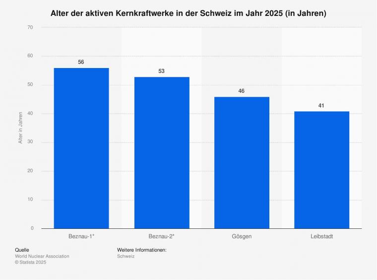 Die Statistik zeigt das Alter der vier aktiven Kernkraftwerke in der Schweiz im Jahr 2025. Der älteste Block Beznau 1 erzeugt seit 56 Jahren Strom.