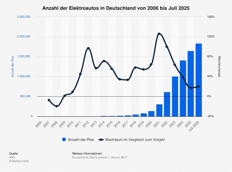 Rund 1,8 Millionen Elektroautos gab es zum Stand am 1. Juli 2025 in Deutschland. Das waren etwa 20,1 Prozent mehr als am 1. Juli des Vorjahres. Die Anzahl an zugelassenen Elektroautos in Deutschland überstieg Ende des Jahres 2022 erstmals die Millionenmarke. Abgebildet werden Pkw mit ausschließlich elektrischer Energiequelle (BEV). Je nach Definition werden auch Plug-In-Hybrid-Pkw als Elektroautos gezählt. Ihr Bestand belief sich am 1. Juli 2025 erstmals auf über eine Million Fahrzeuge.