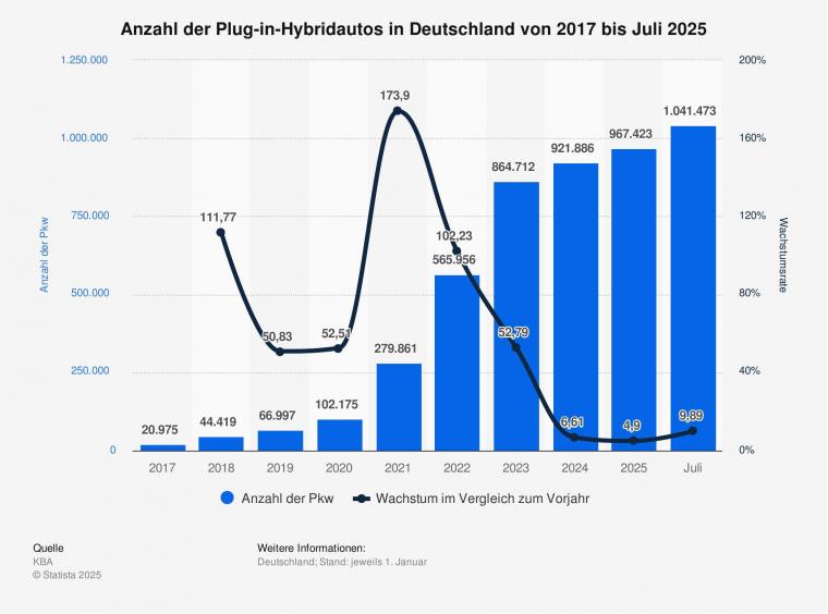 Zum Stichtag am 1. Juli dieses Jahres wurden in Deutschland erstmals mehr als eine Million Plug-in-Hybride gezählt, was einem Anstieg von rund 9,9 Prozent im Vergleich zum 1. Juli 2024 entsprach. Das Wachstum hat sich in den vergangenen Jahren stark verlangsamt. So wurde 2022 noch eine Wachstumsrate von über 100 Prozent verzeichnet. Die Zahlen basieren auf Angaben des Kraftfahrtbundesamtes (KBA). Plug-in-Hybride (PHEV) sind Autos, die mit einem elektrischen und einem Verbrennungsmotor angetrieben werden. Dabei können sie, im Gegensatz zu anderen Hybridautos, auch am Stromnetz geladen werden.