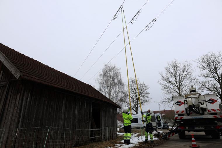 Neun Meter über dem Boden und mitten im 20.000-Volt-Netz: Johannes Blößl (links im Bild) und Martin Peterlik vom Arbeiten-unter-Spannung-Team des Bayernwerks prüfen mit Teleskopstangen, ob eine flexible Trennstelle in der Freileitung korrekt funktioniert. Diese Bauteile wirken wie mobile Schalter im Mittelspannungsnetz. Netzbetreiber können damit einzelne Leitungsabschnitte bei Wartung oder Störungen gezielt vom Netz trennen, ohne gleich ganze Ortschaften abzuschalten. Die Monteure arbeiten dabei direkt an der unter Spannung stehenden Leitung. Mit isolierten Werkzeugen, Bypass-Leitungen und Messungen stellen sie sicher, dass der Strom während der Arbeiten weiter über eine Brücke fließt. So bleibt die Versorgung im laufenden Betrieb stabil – in diesem Fall für rund 50 Haushalte, während oben in der Leitung Technik nachgerüstet und geprüft wird.