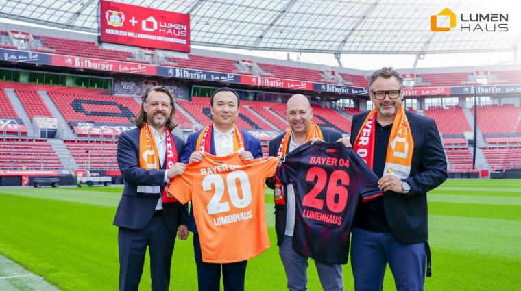 Energiekonzerne machen sich rar auf den Trikots der deutschen Fußball-Bundesliga. Auch auf den Trikots der Erstliga-Elf von Bayer 04 Leverkusen prangt kein Logo eines Energieunternehmens, sondern für bis zu 8 Millionen Euro pro Jahr das der Versicherung Barmenia Gothaer. Aber: Ein, zwei Stufen darunter ist jetzt der grüne Hausautarkie-Anbieter Lumenhaus einer der Premiumsponsoren der Werkself geworden. Er darf wenigstens auf gewissen Trikots Energie sichtbar machen. Das Foto zeigt zwei Ergebnisse mit (von links) Adrian Bühler (Director Marketing Lumenhaus), Dai Wang (CEO Lumenhaus), Fernando Carro (CEO von Bayer 04) und Markus Breglec (Marketing- und Innovationschef von Bayer 04).