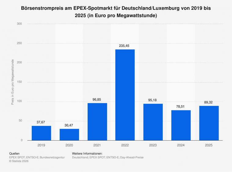 Im Jahr 2025 betrug der durchschnittlich gehandelte Preis für Strom im Marktgebiet Deutschland/Luxemburg rund 89,32 Euro/MWh und lag damit deutlich tiefer als zwei Jahre zuvor. Grund für die gestiegenen Kosten, vor allem während des Jahres 2022, war der akute Erdgasmangel aufgrund des russischen Angriffskrieges und den damit einhergehenden Preissteigerungen. Im Oktober 2018 änderte sich das Marktgebiet von Deutschland/Österreich zu Deutschland/Luxemburg.