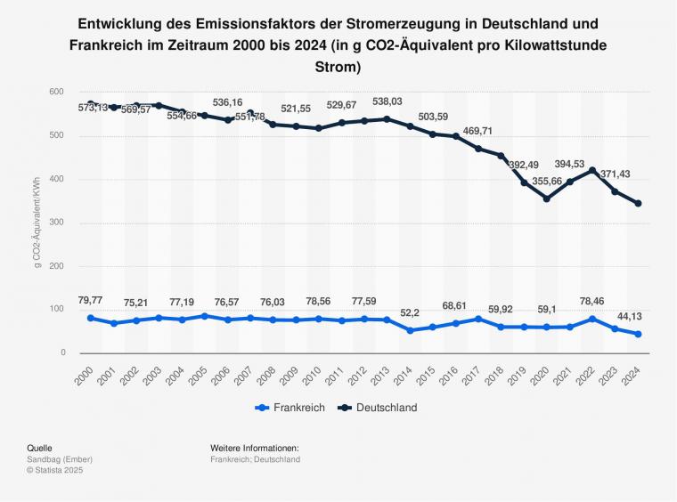 Der Treibhausgas-Emissionsfaktor der Stromerzeugung in Deutschland fiel im Zeitraum 2000 bis 2024 regelmäßig deutlich höher aus als in Frankreich. In Deutschland lag der Emissionsfaktor der Stromerzeugung 2024 bei 343,96 Gramm in CO2-Äquivalenten pro Kilowattstunde, in Frankreich bei rund 44 Gramm in CO2-Äquivalenten pro Kilowattstunde. 2024 produzierte Frankreich 67,3 Prozent seines Strombedarfes in CO2-freien Atomkraftwerken.