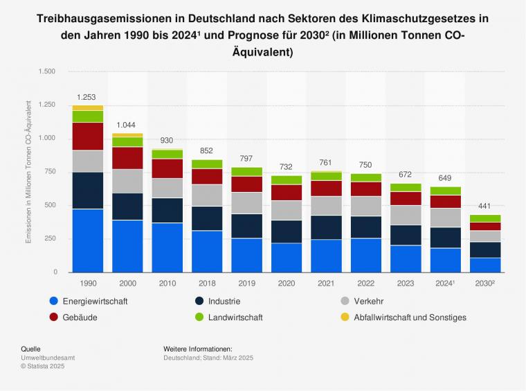 Im Jahr 2024 war die Energiewirtschaft für 185 Millionen Tonnen CO2-Äquivalente Treibhausgasemissionen in Deutschland verantwortlich. Die gesamten Treibhausgasemissionen in Deutschland betrugen im selben Jahr rund 649 Millionen Tonnen CO₂-Äquivalente. Damit wurde die gesetzlich erlaubte, angepasste Jahresemissionsgesamtmenge von 693,4 Millionen Tonnen CO2-Äquivalenten unterschritten. Laut Gesetz sollen die Treibhausgasemissionen bis 2030 um 65 Prozent gegenüber dem Jahr 1990 reduziert werden.