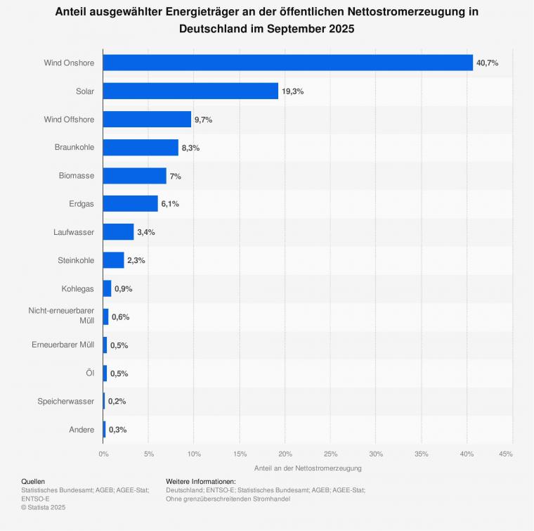 In der Kalenderwoche 37 vom 8. bis 14. September 2025 haben die Windenergieanlagen an Land knapp 41 Prozent des deutschen Strombedarfs gedeckt. Zusammen mit den Windrädern auf See war es leicht mehr als die Hälfte. Der Anteil der Photovoltaikanlagen als zweitgrößter Stromquelle betrug knapp 20 Prozent. Braunkohle trug in jener Woche gut 8 Prozent zum deutschen Strommix bei. Insgesamt wurden 7,6 Milliarden kWh Strom erzeugt.