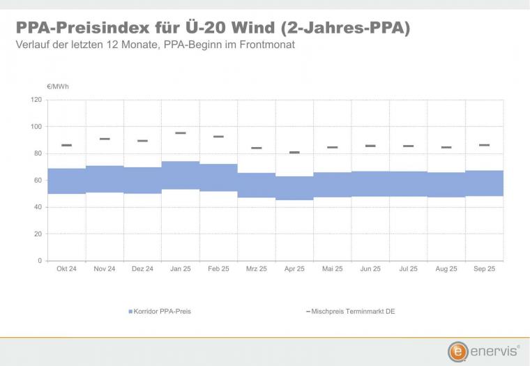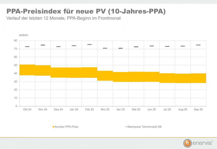 des Analysehauses Enervis für den gemeinsamen PPA-Preisindex mit Energie & Management. Demnach haben die Preise im Terminmarkt im September, die die Referenzpreise für PPA bilden, an der Börse EEX sowohl für