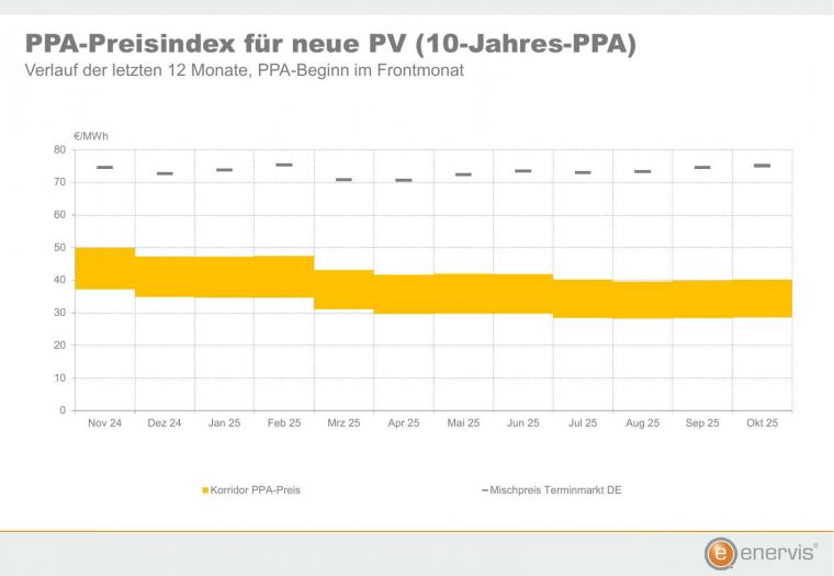 Für PPA auf neue Photovoltaik-Freiflächenanlagen mit zehnjähriger Stromlieferung mit einem Lieferstart im November 2025 lag der Preiskorridor im Oktober zwischen 29 und 40 Euro/MWh. Der dazu korrespondierende Terminmarkt-Mischpreis im Oktober für die betreffende PPA-Laufzeit lag bei circa 75 Euro/MWh.