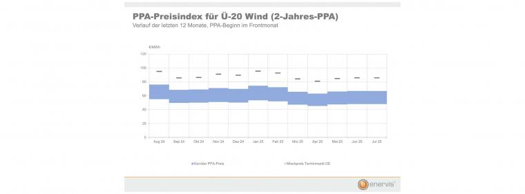 Für PPA auf bestehende, über 20 Jahre alte, ausgeförderte Windenergieanlagen an Land (sogenannte Ü20-Anlagen) mit zweijähriger Stromlieferung vom August an ermittelten die Analysten von Enervis eine realistische Schwankungsbreite im Juli von 48 Euro/MWh bis 67 Euro/MWh. Diese hängt neben dem Terminmarkt-Mischpreis vom Standort, Anlagentyp und weiteren PPA-Parametern ab. Die PPA-Preisrange liegt somit auf dem Niveau des Vormonats Juni.
