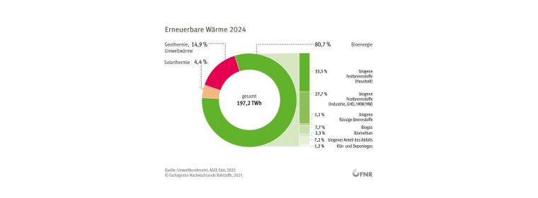 Demnach trägt Wärme aus erneuerbaren Energiequellen derzeit mit rund 20 Prozent zur gesamten Wärmeversorgung in Deutschland bei. Den mit Abstand größten Beitrag innerhalb dieses Segments liefert Biomasse. Insbesondere Holzbrennstoffe wie Scheitholz, Holzpellets und Holzhackschnitzel kommen sowohl in privaten Haushalten als auch bei Stadtwerken und in der Industrie zum Einsatz.