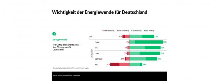 Laut der Erhebung sehen 73 Prozent der Befragten die Energiewende als wichtig für Deutschland an und wünschen sich mehr Investitionen in erneuerbare Energien. Demgegenüber lehnt eine Mehrheit von 59 Prozent den Bau neuer Gaskraftwerke ab. Unter den Anhängerinnen und Anhängern der Union steigt die Ablehnung auf 61 Prozent.