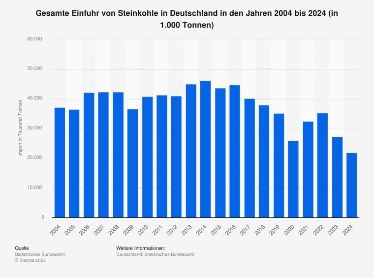 Die Bedeutung der Steinkohle in Deutschland nimmt ab. Die Einfuhr von Steinkohle in Deutschland ist in den vergangenen Jahren auf ein Niveau von weniger als 22 Millionen Tonnen im Jahr 2024 gesunken. Der Höchstwert nach der Wiedervereinigung von mehr als 46 Millionen Tonnen wurde im Jahr 2014 verbucht.