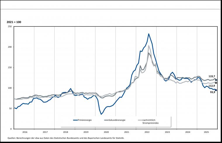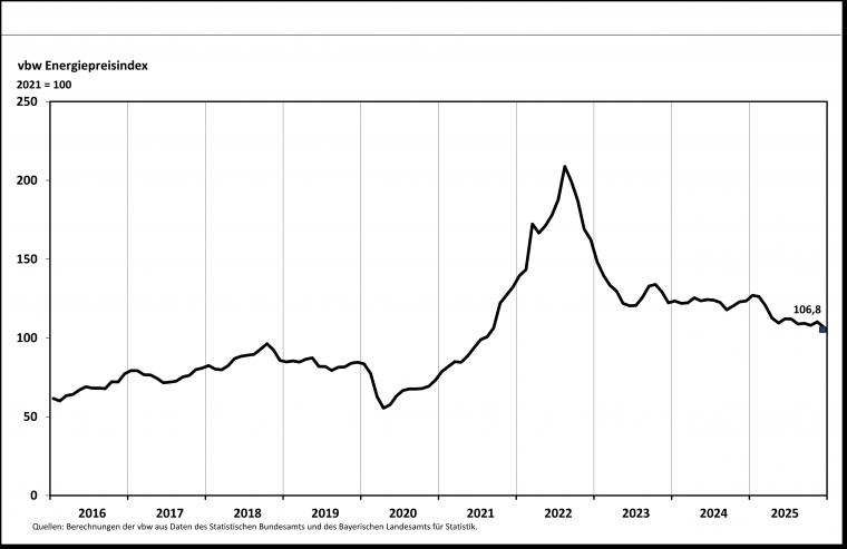 Der Energiepreisindex der Vereinigung der Bayerischen Wirtschaft (VBW) lag im Dezember 2025 bei 106,8 Punkten.