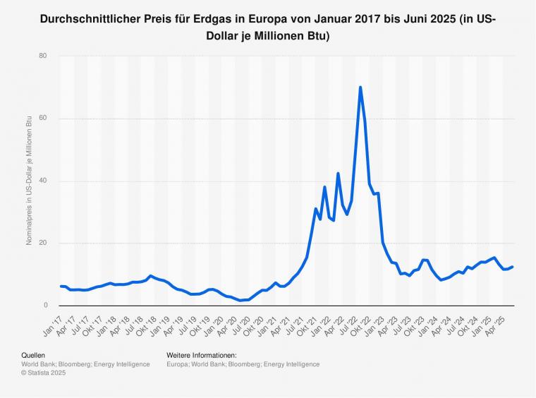 Der durchschnittliche Preis für Erdgas in Europa hat sich im Zeitraum von Januar 2017 bis Juni 2025 wechselhaft entwickelt. Die Preisangaben beziehen sich auf den virtuellen Handelspunkt im niederländischen Gasnetz (Title Transfer Facility, TTF). Im Juni 2025 belief sich dort der durchschnittliche Preis von einer Million British Thermal Units Erdgas (BTU) auf 12,37 US-Dollar. Eine Million BTU entspricht 0,293 MWh.
