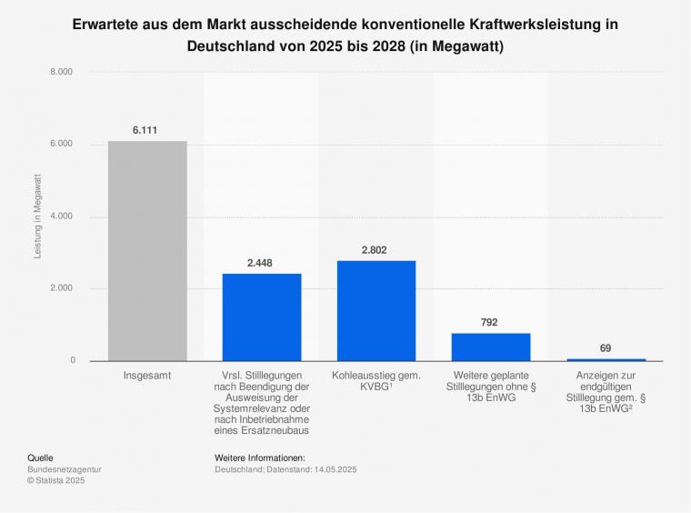 Die erwartete aus dem Markt ausscheidende konventionelle Kraftwerksleistung in Deutschland im Zeitraum von 2025 bis 2028 beträgt rund 6.100 Megawatt. Rund 2.800 Megawatt fallen dabei unter den Kohleausstieg gemäß KVBG (Kohleverstromungsbeendigungsgesetz). Die Daten stammen von der Bundesnetzagentur.