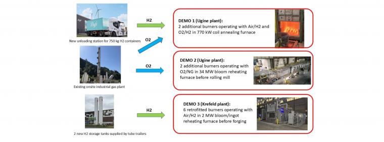 Für die kommenden Jahre sind laut Swiss Steel drei industrielle Demonstratoren vorgesehen, die unterschiedliche Heizprozesse und Produktarten abbilden sollen. Im Einzelnen sind dies Blooms (rechteckige oder quadratische, massive Stahlhalbzeuge), Schmiedebarren (große, meist massive Stahlblöcke, die durch Schmieden weiterverarbeitet werden) und Coils (aufgerollte Stahlbände für die Weiterverarbeitung in der Automobil-, Bau- oder Haushaltsgeräteindustrie). Der erste Demonstrator nahm im März 2025 im Krefelder Werk der Swiss Steel Group seinen Betrieb auf. Er umfasst sechs nachgerüstete Brenner, die mit Luft/Wasserstoff betrieben werden. Er läuft in einem 2 MW Ofen für Blooms und Schmiedebarren. Zwei weitere Demonstratoren sollen 2026 im französischen Ugine starten.