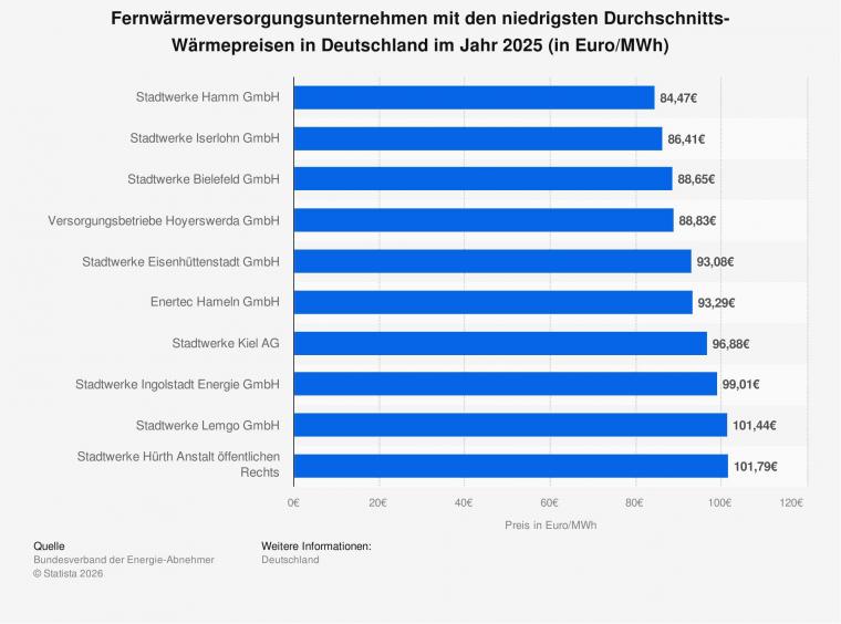 Das preisgünstigste Fernwärmeunternehmen war im Februar 2025 die Stadtwerke Hamm GmbH mit einem Durchschnittspreis von 84,47 Euro pro Megawattstunde. Auf dem zweiten Platz folgten die Stadtwerke Iserlohn.