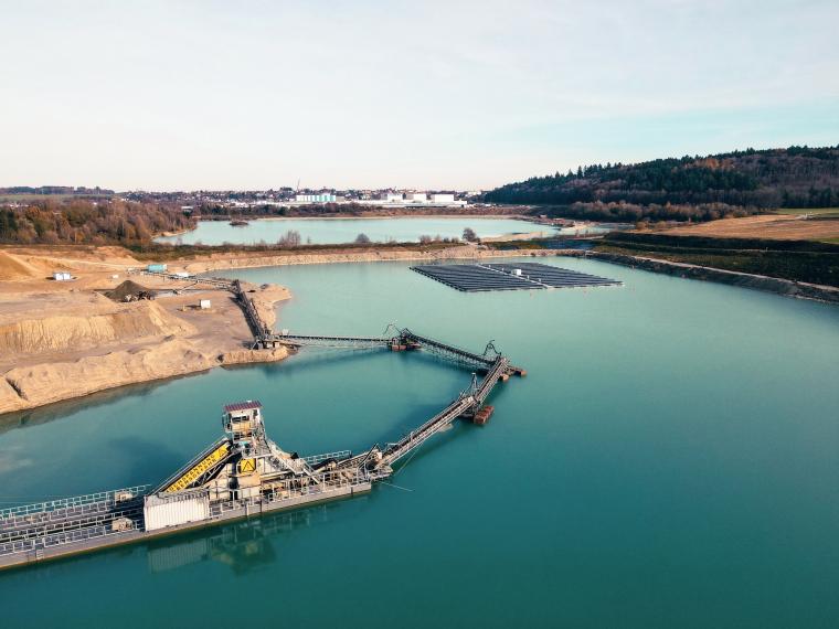 Bereits die zweite schwimmende Solaranlage hat der Energieversorger Erdgas Südwest mit Sitz in Ettlingen (Baden-Württemberg) für die Kies- und Schotterwerke Müller errichtet. Auf dem Baggersee in Pfullendorf in Baden-Württemberg wurden 1.600 Module mit 950 kW Leistung installiert. Sie liefern rund eine Million kWh Strom im Jahr, etwa 60 Prozent gehen direkt in den Brecher, der Rest wird vermarktet, heißt es. Die ebenfalls auf dem See schwimmende Trafostation bringt den Ökostrom auf die passende Netzspannung und verteilt ihn.