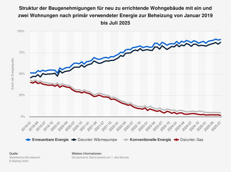 Etwa 90 Prozent der im Juli 2025 genehmigten, neu zu errichtenden Wohngebäude mit ein und zwei Wohnungen sollen überwiegend durch erneuerbare Energien beheizt werden. Der Anteil neu genehmigter Wohngebäude, die durch konventionelle Energien beheizt werden sollen, lag im genannten Berichtsmonat bei lediglich 4,4 Prozent. Die mit etwa 87 Prozent aller erteilten Genehmigungen am häufigsten vorgesehene erneuerbare Energiequelle ist die Wärmepumpe (Umweltthermie und Geothermie). Erdgas dagegen, die am meisten genutzte konventionelle Energiequelle, wurde im Juli 2025 in nur rund 1,5 Prozent der Ein- und Zweifamilienhäuser als primäre Wärmequelle geplant und verliert damit im Wohnungsneubau weiter an Bedeutung.