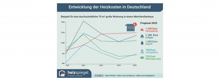 Für eine 70-Quadratmeter-Wohnung im Mehrfamilienhaus liegen dem Heizspiegel zufolge die durchschnittlichen Heizkosten 2025 mit einer Wärmepumpe bei 715 Euro, bei Erdgas bei 1.180 Euro, bei Heizöl bei 1.055 Euro und bei Fernwärme bei 1.245 Euro.
