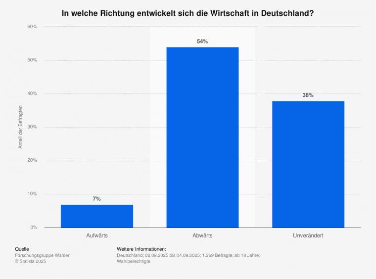Die Statistik zeigt das Ergebnis einer im September 2025 durchgeführten Umfrage zur Wirtschaftsentwicklung in Deutschland. Rund 7 Prozent der befragten Personen waren der Meinung, dass es mit der Wirtschaft in Deutschland aufwärts geht. Im April 2025 prognostiziert die Bundesregierung für die wirtschaftliche Entwicklung eine Stagnation des Bruttoinlandsprodukts für das Jahr 2025. Die ökonomische Verunsicherung wird durch die Zollandrohungen der US-Administration unter US-Präsident Donald Trump verschärft, mit womöglich großen Folgen für die deutsche Wirtschaft.