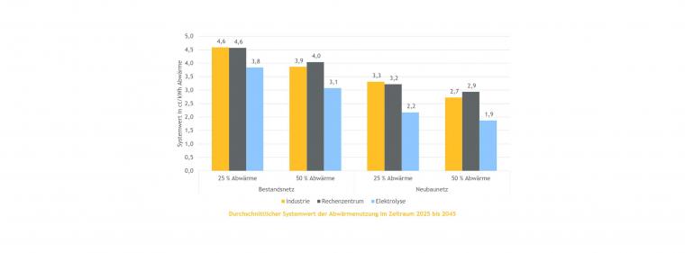 Der Systemwert beschreibt das Einsparpotenzial bei den Gesamtkosten des Wärmenetzes, wenn Abwärme genutzt wird. In Neubaunetzen liegt dieser laut EWI zwischen 1,9 und 3,3 Cent/kWh, in Bestandsnetzen zwischen 3,1 und 4,6 Cent/kWh. Der Unterschied ergibt sich, so erklären es die Autoren, aus den höheren Vorlauftemperaturen in bestehenden Netzen, die den Einsatz von Großwärmepumpen teurer machen. Damit steigt der Wert der eingespeisten Abwärme.