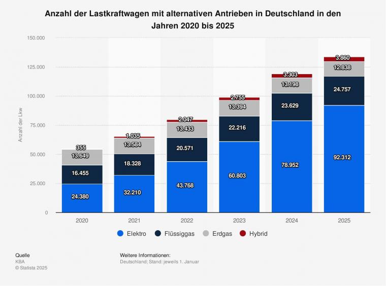 Zu Beginn des Jahres 2025 gab es in Deutschland insgesamt rund 92.300 Lkw mit vollelektrischem Antrieb. Im Vergleich zum Vorjahr stieg der E-Lkw-Bestand damit um etwa 17 Prozent. Die gesamte Zahl der Lkw mit alternativem Antrieb stieg weiter an, der Großteil der Lastkraftwagen wird aber weiterhin mit Diesel betrieben. Der Statistik liegen die Zahlen des Kraftfahrtbundesamtes (KBA) zugrunde.
