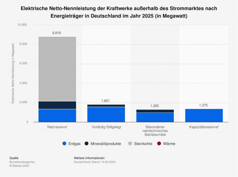 Im Jahr 2024 verfügten die Steinkohle-Kraftwerke in Deutschland, die der Netzreserve dienen, über eine Leistung von rund 6.700 Megawatt. Die vorläufig stillgelegten Kraftwerke könnten insgesamt eine Leistung von rund 1.800 Megawatt erreichen. Kraftwerke außerhalb des Strommarktes bezeichnen die Kraftwerke, die hauptsächlich der Versorgungssicherheit dienen und bei starker Belastung oder Extremsituationen zum Einsatz kommen.