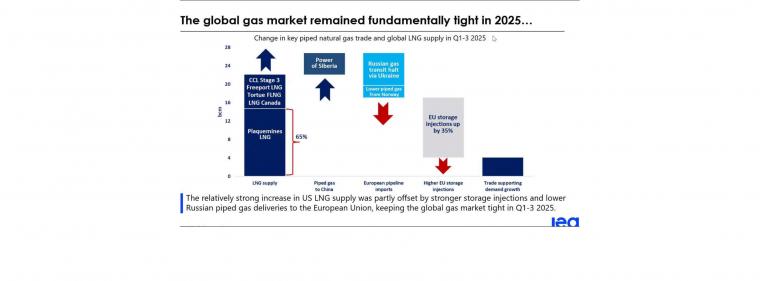 Nach dem Angebotsschock in den Jahren 2022 und 2023 hatte die IEA für 2024 und 2025 zwar eine schrittweise Stabilisierung beobachtet, die Märkte blieben jedoch angespannt. Die Gaspreise lagen weiterhin deutlich über historischen Durchschnittswerten, was das Nachfragewachstum bremste. Besonders in Teilen Asiens führten diese Preisniveaus dazu, dass alternative Energieträger bevorzugt wurden oder es zu Einsparbemühungen kam.