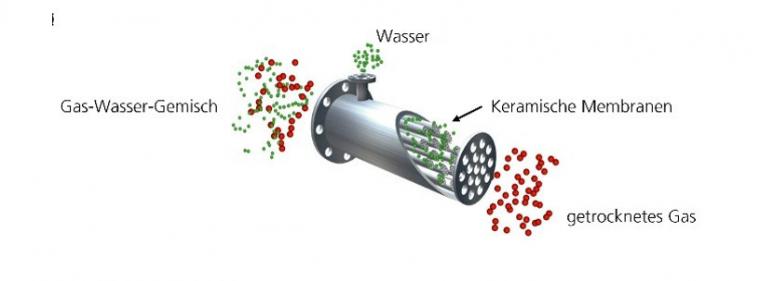 Beim bisher üblichen Verfahren wird TEG zur Wasseraufnahme verwendet. Vor der erneuten Verwendung der Chemikalie muss das Wasser durch Destillation bei etwa 200 Grad Celsius wieder entfernt werden. Dabei entstehen Rückstände, die verbrannt werden müssen. Dieser energieintensive Prozess verursacht zusätzliche CO2-Emissionen.Die Fraunhofer-Forschenden am Standort Hermsdorf (Thüringen) setzen stattdessen auf eine keramische Membran, die selektiv Wassermoleküle aus dem Gasstrom entfernt. Die Membran besteht aus einer mikrometerdünnen Schicht mit Poren von 0,4 Nanometern, die auf einen Keramikträger aufgebracht ist. Wassermoleküle mit einem Durchmesser von 0,28 Nanometern können diese Poren passieren, größere Gasmoleküle jedoch nicht.
