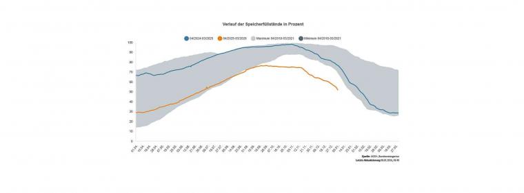 Der Marktgebietsverantwortliche Trading Hub Europe (THE) habe anders als während der Energiepreiskrise 2022 nicht eingreifen müssen, um Speicher zu befüllen, teilte er mit. Dies hätte zusätzliche Kosten für Gaskunden oder Steuerzahler vermieden. Zu Beginn des russischen Angriffskriegs auf die Ukraine war Deutschland noch stark von russischem Gas abhängig, vor diesem Hintergrund war eine Gasspeicherumlage erhoben worden. Diese wird aktuell aus dem Bundeshaushalt gezahlt.