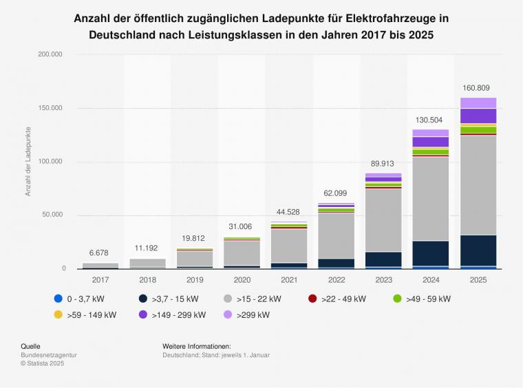 Die Anzahl der öffentlichen Ladepunkte in Deutschland mit hohen Ladeleistungen nimmt nach Angaben der Bundesnetzagentur weiter zu. Allerdings dominierten auch noch zu Beginn des Jahres 2025 die „Normalladepunkte“ (Ladepunkte mit bis zu 22 kW Leistung). Mit fast 125.000 Normalladepunkten machten diese etwa 77,7 Prozent der Gesamtheit aller Ladepunkte aus. Zum Stichtag 1. Januar 2025 gab es in Deutschland rund 160.800 öffentliche Ladepunkte.