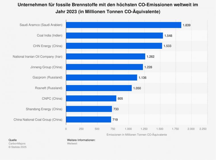 Das Erdölunternehmen Saudi Aramco war im Jahr 2023 für den Ausstoß von rund 1.839 Millionen Tonnen CO2-Äquivalente verantwortlich. Damit belegt die derzeit größte Erdölfördergesellschaft weltweit den ersten Platz des Rankings der klimaschädlichsten Unternehmen gemessen am Treibhausgasausstoß. Insgesamt sind 36 Unternehmen verantwortlich für etwa die Hälfte der weltweiten CO2-Emissionen. Zu diesem Ergebnis kommt eine Datenanalyse von Carbon Majors.