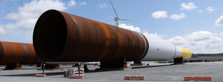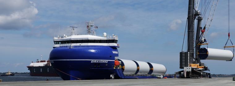 Der Ostseehafen Odense dreht in Sachen Windenergie richtig auf - hier der Umschlag von Offshorewind-Turmsegmenten