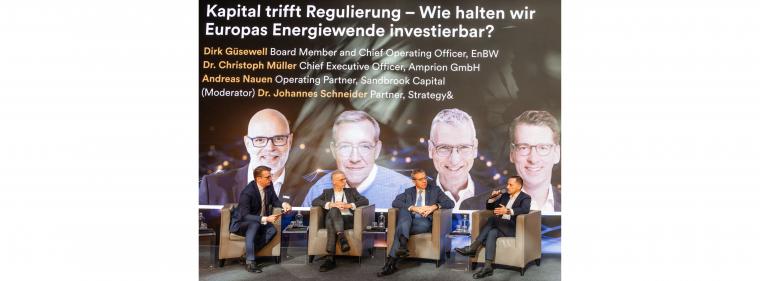Podiumsdiskussion mit (v.li.): Moderator, Andreas Nauen (Sandbrook Capital), Christoph Müller (CEO Amprion) und Thomas Kusterer