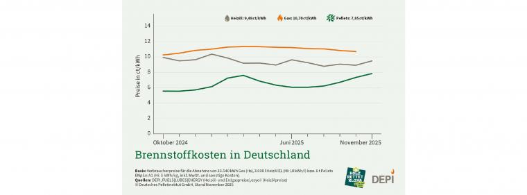 „Ein Preisanstieg im Herbst ist grundsätzlich typisch, da sich der Markt mit Beginn der Heizsaison üblicherweise kontinuierlich belebt. Wer es versäumt hat, in Frühjahr und Sommer sein Lager zu befüllen, muss in der Heizperiode nachfüllen und bezahlt hierbei höhere Preise“, erklärt Depi-Geschäftsführer Martin Bentele. „In diesem Jahr fällt der Anstieg etwas stärker aus, was unter anderem auf höhere Kosten in der Produktion und Logistik zurückzuführen ist.“ Dennoch sei die langfristige Preisentwicklung bei Holzpellets stabiler als bei fossilen Energien.