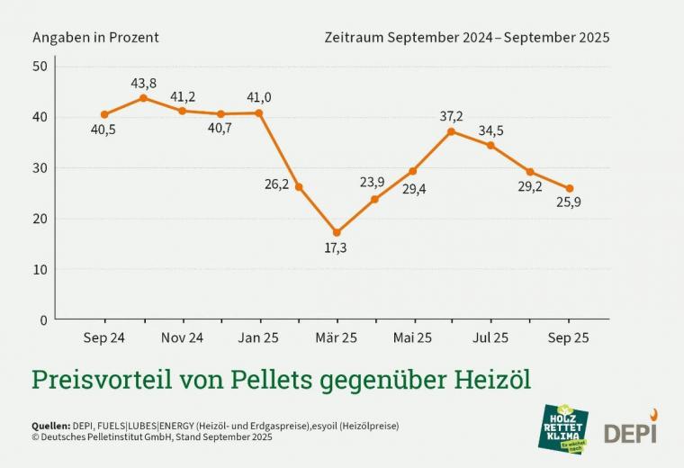 Umgerechnet zahlen Nutzer aktuell 6,70 Cent pro kWh Wärme. Gegenüber dem Vormonat bedeutet dies ein Plus von rund 7,8 Prozent. Doch sind Holzpellets immer noch um einiges billiger als Heizöl „Der Preisvorteil gegenüber Heizöl liegt bei rund 26 Prozent“, so das Depi.