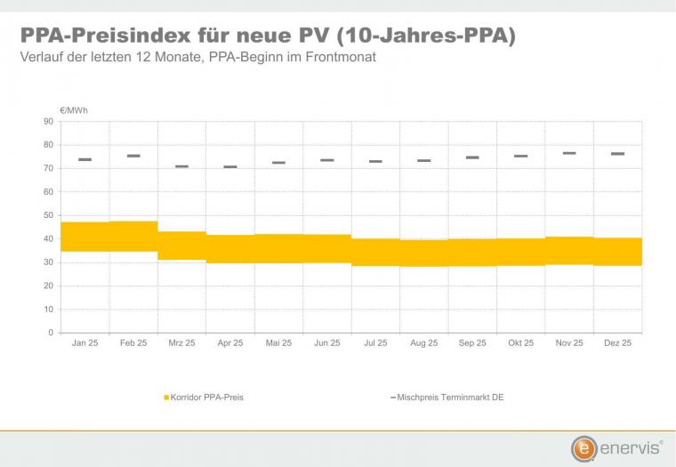 Die Preiskorridore für marktübliche Power Purchase Agreements sind im Dezember 2025 gesunken. Das ergibt der PPA-Preisindex von E&M und Enervis.