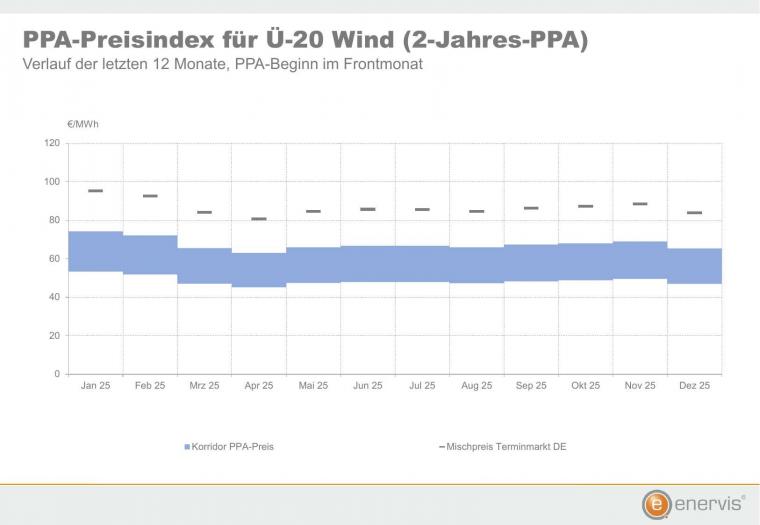 Für PPA auf bestehende, über 20 Jahre alte, ausgeförderte Windenergieanlagen an Land (Ü20-Anlagen) mit zweijähriger Stromlieferung vom Januar an ermittelten die Analysten von Enervis eine realistische Schwankungsbreite im Dezember von 47 Euro/MWh bis 65 Euro/MWh. Diese hängt neben dem Terminmarkt-Mischpreis unter anderem von Standort und Anlagentyp ab. Die PPA-Preisrange liegt somit unterhalb des Niveaus des Vormonats November.