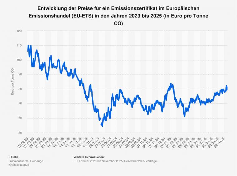 Der Preis für Emissionszertifikate im Europäischen Emissionshandelssystem (EU-ETS) erreichte im Februar 2023 mit 100,34 Euro pro Tonne CO2 ein Rekordhoch, sank aber bis Ende Februar 2024 auf rund 55 Euro. Anfang November 2025 lag der Preis bei rund 80 Euro pro Tonne CO2. Ein Grund dafür ist die geringe Nachfrage: Die Industrie in der EU produziert weniger als erwartet und verbraucht damit auch weniger fossile Brennstoffe. Dadurch ist auch der Bedarf an Zertifikaten geringer und die Preise sinken. Die Nachfrage wird dazu durch eine erhöhte Verfügbarkeit von erneuerbaren Energien gesenkt. Die Daten beruhen auf einer Erhebung von Intercontinental Exchange.