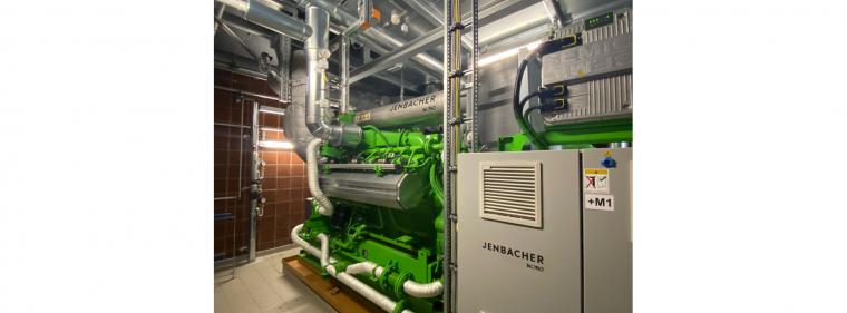 Kern der Anlage bildet seit November 2025 ein neues BHKW-Modul. Der Jenbacher-Motor stammt von der „INNIO Group“ und erreicht rund 470 kW elektrische und 550 kW thermische Leistung. Am BHKW-Modul wurden drei Abgaswärmetauscher in Reihe geschaltet. Die Komponenten nutzen die im Abgas enthaltene Wärme in mehreren Stufen. Der erste Wärmetauscher arbeitet im Hochtemperaturbereich. Ein weiterer Wärmetauscher nutzt den Heizwasserrücklauf und der dritte den Quellenkreis der Wärmepumpe. Die Betriebszeit des Jenbacher-Motors beträgt laut Auskunft des BHKW-Lieferanten Energas rund 7.000 Stunden im Jahr.