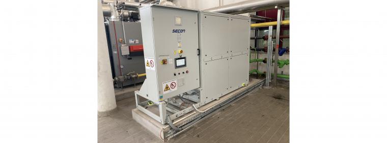 Wärmepumpe für die Niedertemperatur-Restwärme des BHKW stammt vom Hersteller Secon, Kältemittel Isobutan, 190 kW Wärmeleistung;