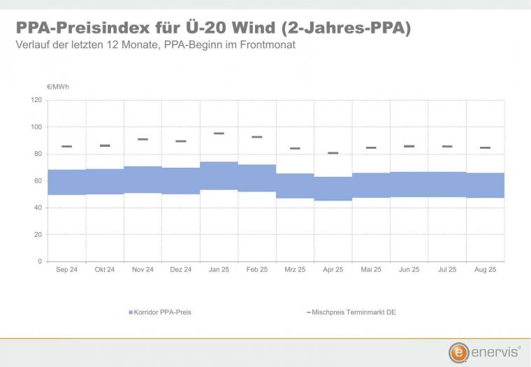 Die Preiskorridore für marktübliche Power Purchase Agreements sind im August 2025 gesunken. Das ergibt der PPA-Preisindex von E&M und Enervis.