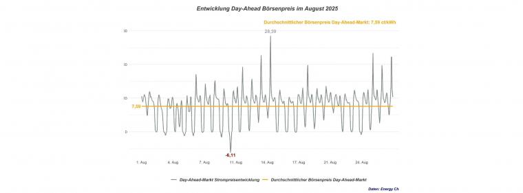 Der durchschnittliche Strompreis im August für den nächsten Tag (Day-Ahead) lag an der Strombörse bei 7,6 Cent/kWh und damit rund 1,2 Cent niedriger als im Juli. Dort betrug der Preis im Schnitt 8,78 Cent/kWh. Das hat das Energieunternehmen Rabot Energey errechnet.