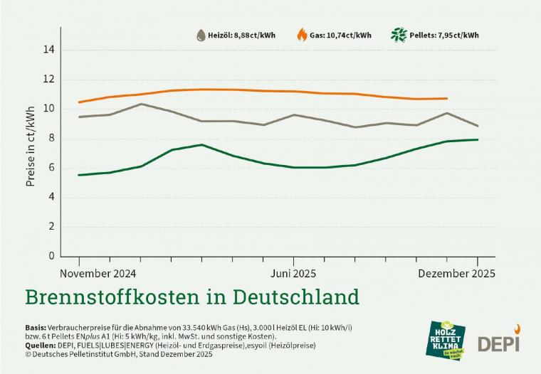 Die Kilowattstunde Holzenergie kostet zum aktuellen Zeitpunkt 7,95 Cent. „Eine zentrale Rolle spielen die bislang moderaten Temperaturen, die den Heizbedarf niedrig halten und damit auch die Nachfrage nach Holzpellets in der laufenden Heizperiode dämpfen“, erklärt Depi-Geschäftsführer Martin Bentele. Zudem würden private Endverbraucher üblicherweise außerhalb der Wintermonate bestellen.