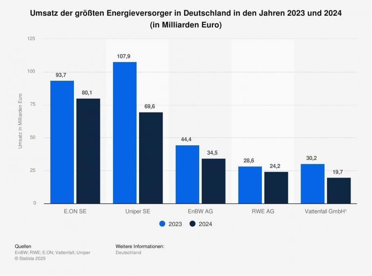 Im Jahr 2024 war Eon mit einem Umsatz von rund 80,1 Milliarden Euro der größte Energieversorger in Deutschland. Uniper folgte mit einem Umsatz von 69,6 Milliarden Euro auf Platz zwei der größten Energieversorger Deutschlands. Quelle: Statista