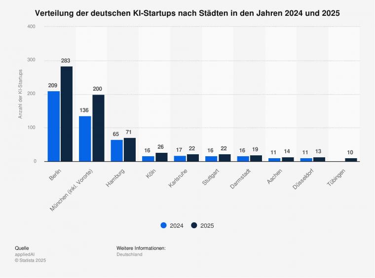 Eine Standortanalyse der KI-Startups in Deutschland ergab, dass 283 Start-ups aus dem Bereich Künstliche Intelligenz in Berlin angesiedelt sind. Danach folgten die Städte München (200) und Hamburg (71). Die Anzahl der KI-Startups in Deutschland steigt seit Jahren.